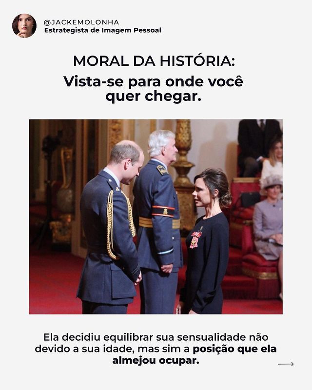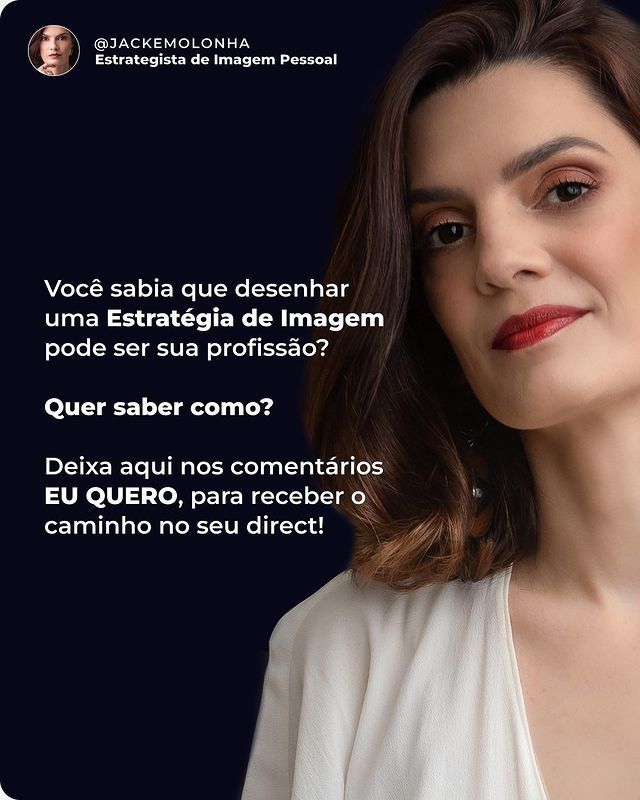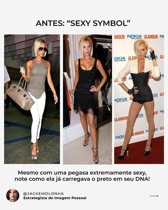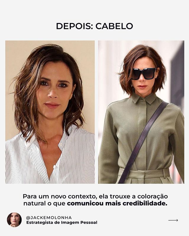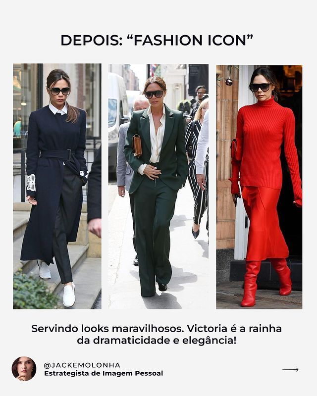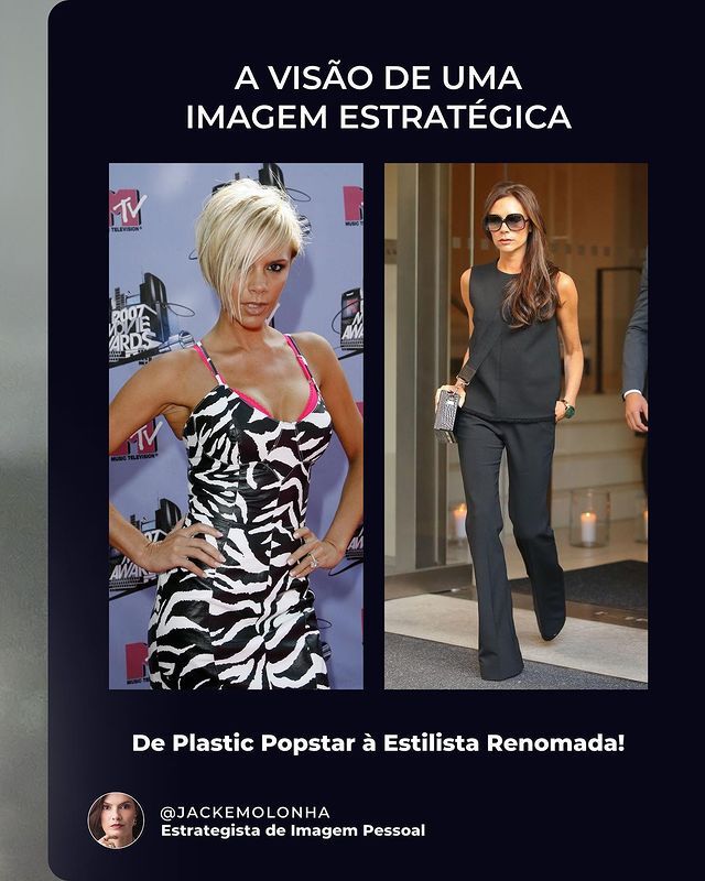 Veja como a @jackemolonha chamou a atenção ao analisar a estratégia de imagem utilizada pela Victoria Beckham ao longo do tempo. Ela usou uma personalidade famosa para gerar interesse e despertar o desejo de quem deseja melhorar a sua imagem também. Esse é aquele tipo de post ideal para uma chamada para ação final para que a pessoa conheça mais do serviço oferecido por ela.